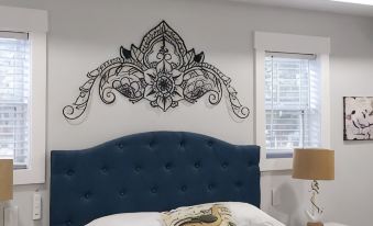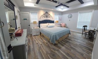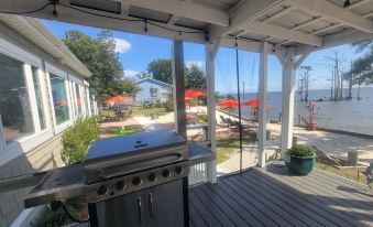 This 640 sq. ft. apartment boasts a private entrance and is a newly appointed getaway. The kitchen offers a scenic view of the Albemarle Sound, complemented by dramatic ceilings and coastal-themed furnishings and decor.