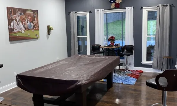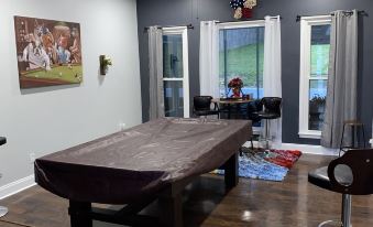 The whole group will enjoy easy access to everything, from this centrally located home away from home. Relax and enjoy the master suite that features a comfortably oversize jacuzzi tub for two! Enjoy a fun day filled with playing a game on the pool table or board games with family and friends. Comfortable quality size mattresses providing the best sleep. Two separate living rooms for a large group. Enjoy the back patio with a cup of coffee or hot chocolate. It is also equipped with a grill. There is also a fire pit in the backyard in which wood is also provided.