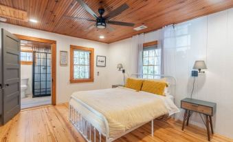 2Br/1Ba home with modern amenities. Hardwood floors, original wood trim and true rocking chair front porch add to the character of this mountain getaway. The cabin has an open floor plan featuring large living room with a sleeper sofa, rock fireplace and kitchen with large island. One bedroom has one queen bed and the second bedroom has 2 queen beds. Bathroom has walk in shower and stackable washer/dryer. This is an older home so layout is a little funky, to go to the bathroom you have to walk through the master bedroom. Creek gets stocked several times a year with trout by DNR.