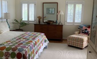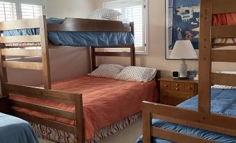 The spacious king bedroom is on the main floor with a private porch. Its bathroom has double sinks, a Jacuzzi tub, and separate shower. On the top floor are 3 spacious bedrooms with large dressers and closets and private bathrooms. Two rooms have 2 queen beds each and one room has 2 queen bunk beds (extra long singles over queens) and a separate twin.