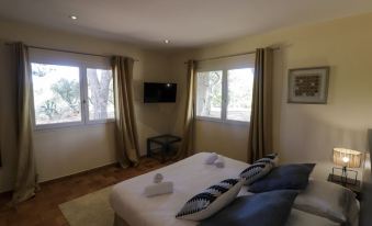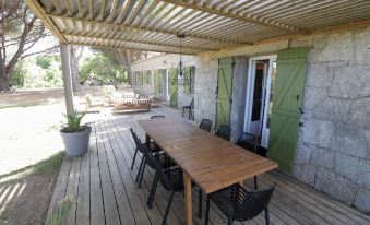 Very beautiful luxury villa, located 6 km from downtown Porto-Vecchio on the Arena estate. The Arena domain is a 40 hectare olive grove crossed by a shaded river. Villa entirely in granite stones with an area of 240 square meters air conditioned. It consists of 4 large bedrooms, each with their own bathroom, living and dining room with American kitchen. This house has a private swimming pool surrounded by an IPE wooden beach of approximately 100 m2. The terrace is equipped with: an outdoor lounge, table and chairs for the dining area and deckchairs. The kitchen is fully equipped: oven, ceramic hob, microwave, fridge freezer, plates, cutlery, glasses, complete cookware. The living room: sofa, coffee table, flat screen TV, fireplace. the bedrooms: bathroom with WC, 160 bed, large dressing room, and flat screen TV in each bedroom. Linen: sheets and towels are provided. A room serving as a storage room with ironing board, steam iron, and washing machine.