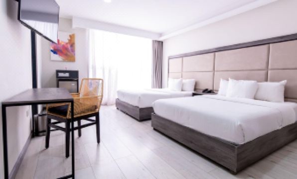 Elegimos el hotel en el momento. Es un estilo departamento- hotel. Las habitaciones tenian buen espacio y el baño también. La atención fue muy amable. Quiza algunos detalles como el tapiz un poco descuidado, las paredes con manchas de zapatos o propiamente de uso por lo que pudiera dar un aspecto no tan limpio cuando estaba bien.