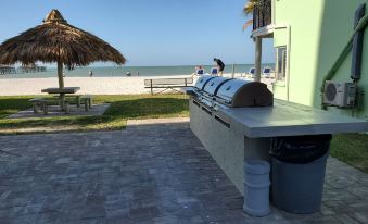 ** Heated, beachfront pool with lounge chairs, BBQ grills, and Tiki dining area.