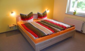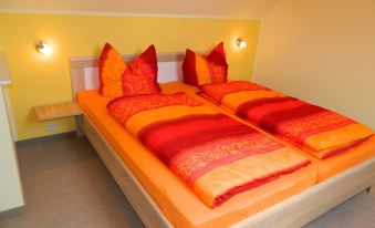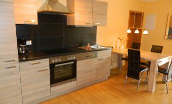 Size approx. 50 m², each with a bedroom (2 people) and a comfortable extra bed in the living area (possible for 1 additional person). Living / dining room: SAT-FULL HD TV, radio, Internet WLAN, 1 bedroom double bed, 1 comfortable living couch (with extra bed as a sleeping possibility), kitchenette, 4-zone ceramic hob with oven, refrigerator with freezer, dishwasher, coffee machine, kettle, toaster and sufficient dishes, bathroom with shower / toilet, terrace, garden furniture, barbecue area, car parking space. Non smoking.