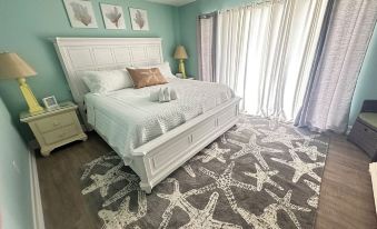 The Master bedroom features a king-size bed, smart tv, dresser, ensuite bathroom, large closet, and sliding glass doors with darkening shades for those mornings you want to sleep late. The sliding glass doors also provide access to the covered patio with amazing views of the pool and ocean!