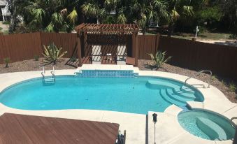 This CHARMING and COMFORTABLE beach bungalow features a large open living and dining concept for great family gatherings, a spacious kitchen with ample counter space for meal prepping and three bedrooms. The Master suite is a King with tub and shower combo off of the living room. The 2nd bedroom features 2 twin beds and the 3rd bedroom, a Queen. Multiple flat panel smart TV's with NETFLIX capability, help add to your family enjoyment indoors! We also invite you to enjoy our fabulous outdoor area around the private pool. There is even a small kiddie pool which spills over into the main pool. Sorry the pool is not jetted or heated at this time. There is a gas grill (Blackstone) located in the laundry room below for your use. The other two doors to your adjacent right are not for guest use please do not try to open. Please remember to clean and place back after your stay for the next guest! If striking out to the beach is your forte, you are only 2 blocks from the 10th street walk over and you can be there in less than 10 minutes. You can see the walk over from the drive! For those evening sunset walks, try the access on Pine through State protected property to access the white sand beach on the Bay located one block West on the corner of 9th street and Pine.