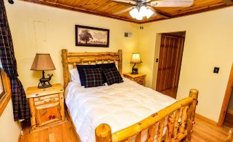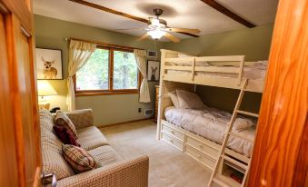 The house has 3 spacious bedrooms. The primary bedroom has a king size bed and access to the main bathroom. One of the upstairs bedrooms has a queen bed, the other a bunk bed and a comfortable queen sleeper sofa. The fully stocked kitchen has everything that you need to prepare a meal for your family and the unique dining table can fit all of you. Come, relax by the fire, watch the deer and maybe a bear strolling through the yard from the spacious sunroom with another comfy queen sleeper sofa.
