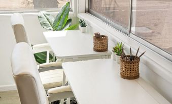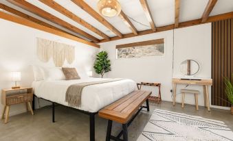 As you settle in, you'll be provided robes, slippers, toiletries, coffee/tea, and high-speed Wi-Fi. The kitchen is fully equipped with stainless steel appliances fit for a chef, and a dining nook that seats four. A queen bed, yoga mats, vanity, and a touch of decor wait for you in the bedroom. You'll find a vinyl record player, acoustic guitar, classic games, a 65" TV, and a fold-out sofa in the living room. A corner workspace has two stations available.