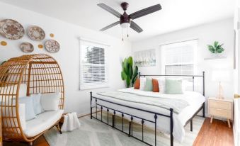 The cozy bedroom is equipped with a king bed, a 55" SMART TV w/ Netflix, one bedside lamp w/ USB port, a ceiling fan, closet, memory foam mattress, a large comfy egg chair, and a walk-in closet!