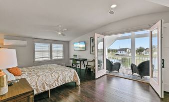 Step inside to an open kitchen, dining, and living area, designed for gathering. The fully stocked kitchen makes meal prep a breeze, or you can check out the fantastic local seafood restaurants. The 1st floor features a comfortable bedroom and a full bathroom with a walk-in shower. Upstairs, the colorful staircase leads to the second bedroom, which opens onto a balcony overlooking a peaceful lake. Enjoy your morning coffee here as you take in the serene view. A perfect spot to unwind.
