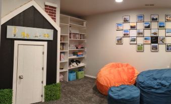 Unleash your playful side in the basement, equipped with a thrilling 20-foot bouldering wall and an arcade cabinet boasting over 10,000 games. Kids can explore the charming playhouse tucked under the stairs or enjoy books, games, and movies in this vibrant space. Unwind in a giant double-seater bean bag or on the L-shaped couch while streaming your favorite shows on the 65” Smart TV. This area is perfect for letting the kids burn off energy while you relax and recharge.