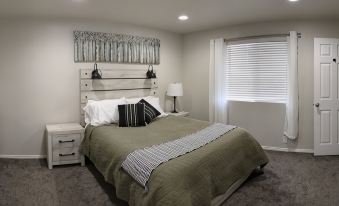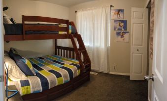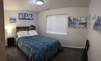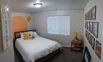 Downstairs, there are two cozy bedrooms: one with a queen bed and an air mattress for additional guests, and another room with a full bed. A full bathroom with a tub is also available, complete with luxurious towels and essentials.