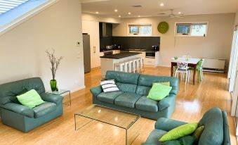 Top Level: 2 x living areas, separate toilet, bathroom (bath and shower), kitchen, 2 x bedrooms (queen bed in each).