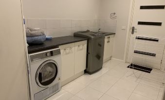 Bottom level: Laundry (washer and dryer), 1 x bedroom (queen bed), 1 x bedroom (2 x single bunks), 1 bathroom (toilet and shower.)