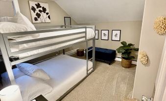 Our bedrooms are a comfortable size - we have 2 queen beds and a bunk bed (full size bed on top & bottom). One of the bedrooms also has a couch that folds into an additional twin sized bed. One bedroom is located downstairs- it has a queen bed. The other two bedrooms are located upstairs- the bunk bed room, and another queen bed with a small couch. Both bathrooms are full bathrooms - we will provide towels, wash cloths, makeup towels and hand towels. Each floor has a full bathroom. We will also provide luxury shampoo, conditioner, and body wash in both bathrooms, as well as hand soap and body lotion.