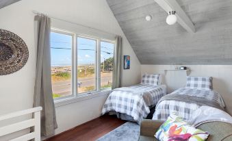 The house itself has three bedrooms, one containing a king size bed and TV, another with a queen size bed, and the third loft bedroom with a fabulous view 30 miles up the Oregon coast that overlooks the great room and has two XL twin beds, a love seat and TV, perfect for the kids, or adults, in your group! There are also two bathrooms in this home, one with a shower/tub combo, and the other with a walk-in shower.