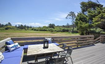 Welcome to Seaside’s Cove Vue! This beautiful two bedroom home with a third loft bedroom and two bathrooms has more than enough room for eight guests. Backing up to the second hole of the Seaside Public Golf course and with the unobstructed view of the Pacific Ocean in front, this rental home, decorated in a warm modern theme, will be your home away from home, summer or winter, while enjoying all that Seaside has to offer. Step inside and find yourself in a two-story great room with plenty of space to relax. You'll find a central seating area with a flat screen TV for fun family gatherings, game playing or puzzle construction. There is a pair of large, comfortable wicker chairs with ottomans, perfect for kicking back and reading or enjoying the beautiful view of the ocean out front. On those cold winter days make a nice fire in the wood fireplace and sit back with a cup of hot chocolate and relax! The dining table expands to seat 12 so there’s room for everyone! The large, sheltered deck overlooking the golf course offers even more room to hang out with your family and friends while catching some sun and barbecuing. The kitchen has everything you'll need to whip up a quick meal with your loved ones or head out a couple blocks north to enjoy great food at the the local pub, cafe with great espressos or golf course restaurants. All three are popular local hangouts with plenty of exciting and unique food choices.