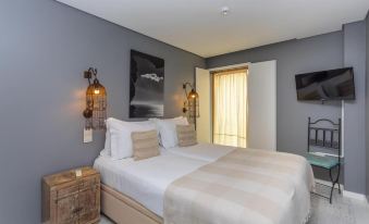 Alle Zimmer verfügen über ein schönes, entspannendes Dekor, das von einer böhmischen Atmosphäre inspiriert ist und über ein Fenster mit Blick auf den Atlantik und die Plaza Sesimbra verfügt.
