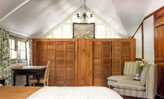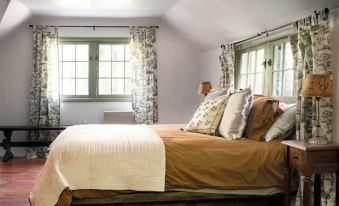 Our cottage is cozy, best for a couple, a small family or a few close friends. The living room w/fireplace, window bench, dining table, kitchen and washer/dryer are all on the first floor. Up our narrow staircase (watch your step!) you will first find our newly renovated bathroom. To the right, there is a large bedroom with a queen bed, writing desk, seating area dresser and closet. On the left, is a small bedroom that just fits a full size bed and dresser. Outside, we have a covered space with seating, a charcoal grill, and a fire pit.