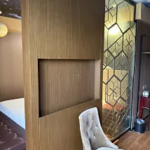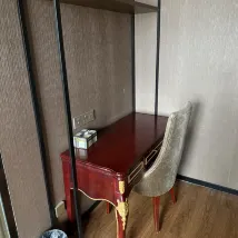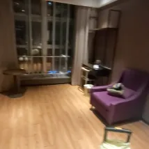 The receptionist that spoke English was fantastic. She was so helpful in securing a reservation for us at a specific restaurant as my Chinese is not fluent. The hotel is in a good location, however it is very old or looks old. It is also just has that dirty look from being old.. My friend had the same style room however I only had a chair in the other room but she had a couch and coffee table 😑 It wasn't a big deal as we were gona most of the time, bit proper furniturewould have been nice. Everything was old and run down though. There is NO electrical outlet in the bathroom, very important to know ahead of time. So to fix my hair for the nice restaurant, I had to run to a mirror and then run to where the kettle was to curl my hair. There was no mirror put in the living space either.