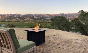 Private, elegant cabin with spectacular 180 degree vineyard views in the heart of wine country. Relaxed setting with tons of outdoor space; large deck with firepit, grill, outdoor seating and dining.