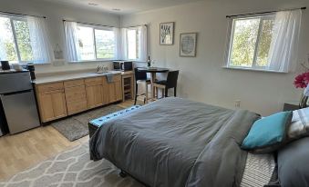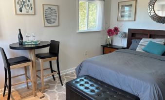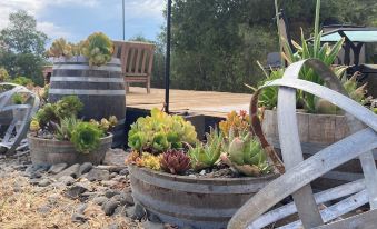 An oversized couch and bistro seating make the space cozy yet stylish with everything you need for your wine country stay. Vineyard views right from the bedside. Coffee maker, toaster, fridge and microwave.