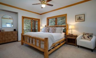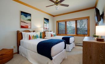 villa west boasts exceptional amenities, including a private sauna, a large hot tub, and a shared pickleball court (available for guest use during the summer months, with paddles and balls provided). three sun-drenched decks provide plenty of space to relax and soak up the sun. for those traveling with kids, the log bunk room is a hit, complete with a foosball table and bean bag chairs. this home comfortably sleeps 12 guests in five beautifully appointed bedrooms. the primary bedroom and two additional bedrooms each feature a king bed and attached bathroom, while the other rooms offer twin beds and twin/twin bunk beds, perfect for children or friends.