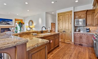 Alpine European architecture is evident through the home as well as fine cabinetry and beautiful stonework. The open floor plan includes an easy access ski prep area to hold your boots and jackets, living room, dining area and kitchen. Supple Restoration Hardware leather furniture is clustered around the large gas fireplace and flatscreen SMART TV, complete with surround sound speakers. The kitchen offers everything you need including a full suite of appliances, cookware, and dishes. A Viking gas stove and oven along with other top of the line appliances ensure that your home cooking will turn out perfectly. For dining, the bar offers three seats, and an attached dining area holds a table for six.