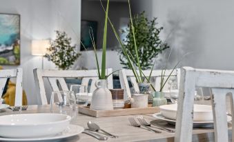 The modern kitchen opens up to the rest of the living space, with bar seating at the far end of the island. Right across from the kitchen is the dining area, with a full dining table that can accommodate up to 6.