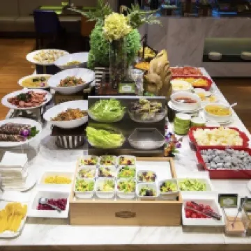 Hotel breakfast with many varieties. I enjoy my breakfast too.
