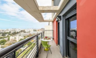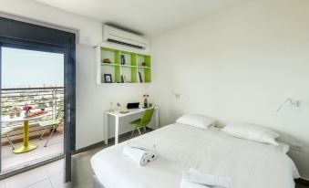 This double room with balcony is a practical and comfortable living space for two people. It's furnished with a double or twin beds, suitable for couples or friends. The balcony provides a peaceful retreat with great views. The apartment is fully equipped with amenities, including a functional living area, kitchenette, private bathroom, and shower. Located in a secure area by Tel Aviv University, it's ideal for students, professionals, or those seeking convenient accommodation near the Expo.