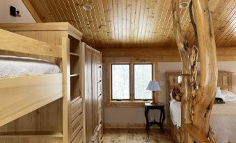 The cabin is elegantly appointed with furnishings that are custom built or from Stickley and Pottery Barn.