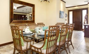 The great room contains a wet bar and a large kitchen island with bar stool seating and a formal dining room area and a more informal dining setting on the lanai.