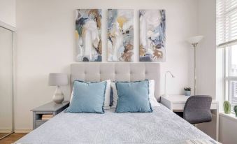 - Bedroom Features Large Size Closet, Queen Bed, Luxury Plush Pillows and Extra Linens.