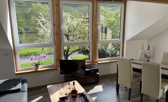 Our family-run apartment with high comfort, plus a fascinating view from the balcony of the river and the steep vineyards can accommodate 2-4 people.