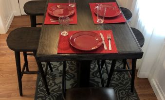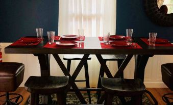 The good: The house was very comfortable and nicely decorated. It is in an older neighborhood but the setting has great large trees in the yard and woods right across the street from the DECK. You can watch squirrels play and listen to many different bird songs from the DECK. The not so good: The host refused to acknowledge there was a deck, thus no need for chairs on the deck and stated for, for whatever reason, that a deck is not listed on Amenities and, thus, "there is no outdoor dining area". The house has a very nice deck, about 12' by 15' and it faces the woods across the street and is well pictured in the listing. He stated "this is a very small house with a very small porch and his solution offered to me, in two different text conversations, was that he could move us to one of his much more expensive properties, as in $400/night, properties with "outdoor patio set ups. If you view many properties on VRBO as I have you are unlikely to find any listings with patios and decks that don't have outdoor seating. Also, if you have a group of any size there are lots of plates but only four glasses, three coffee mugs, and one plastic wine glass.