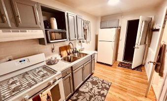 Spacious yet comfy. Entire unit with two bedrooms, living room, full kitchen with gas stove, microwave, coffee maker, refrigerator. Bathroom has full shower/tub bathroom. Fully carpeted with hardwood and vinyl in the kitchen and bathroom. A small private deck and an outdoor grill is also available. Central heat and A/C (A/Cs are out for winter) are available throughout the unit.About pets:Pets allowed: dogs and cats less than 50 lbs per pet (limit 2 pets total).About checkOut:Check out before 10:00 AM.About children:Children allowed: ages 0-17.About customRules:No parties or loud music please as there other people living in the building. If you smoke cigarettes or marijuana please smoke on the porch not insid.Please turn off all lights, tv and ac or heat when checking out..About checkIn:Check in after 4:00 PM.About smoking:Smoking is not permitted.About minBookingAge:Minimum age to rent: 18.About events:No events allowed.