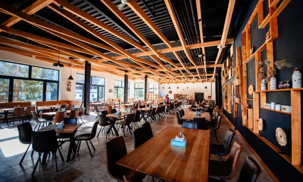 The cottage is being rebuilt after a recent fire. The project looks spectacular, but I did not expect the restaurant to be perfectly functional. Basically, it's the most decent restaurant in the area - industrial design, spacious, homey and elegant at the same time. The terrace is shady, pleasant, and the toilets are clean, well equipped. It seems hard to believe that it is a restaurant located at the foot of the Retezat Mountains, far from urban civilization. The food is good, regional cuisine with a modern touch. I ordered Saramura de Pastrav (grilled trout in a savory sauce), which was delicious. The wine was also good. No complaints about the service - it was fast and efficient, although the terrace was full.