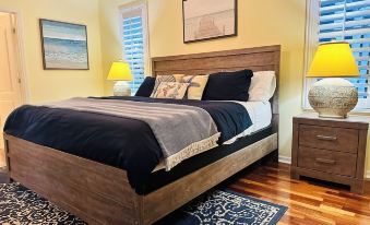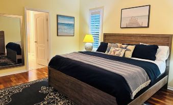 To the left of the living room sits the Private Master Bedroom and Full Bath. The Master Bedroom has it's own secluded area separate from the other rooms and bathroom which are on the other side of the house. The king bed is a new memory foam bed with fresh new linens! The master bathroom has two separate sinks apart from each other, a large tub, and a stand up shower.