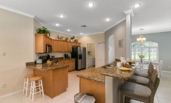 Right outside the living room is access to screened in pool area. There are multiple doors that lead to this large outdoor area. The outdoor area has enough seating for 10-12 people and multiple seating options to enjoy the sun, relax around the pool, and drink a warm cup of coffee in the private screened in area. All the furniture outside is new and there are also lights that have been added to make it a great nighttime retreat also.