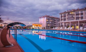 Это не отель, а реально город. Просто ЖК с несколькими кварталами. Отдыхать в нём максимально неудобно, так как это проходной двор и муравейник. Хоть территория и огорожена, но проходят все подряд, никаких ограничений нет. Пандусов тоже практически нигде нет. Даже на ресепшн (со стороны улицы, куда подъехало такси) чемодан пришлось переть по ступенькам. Есть спуск, но со двора, с улицы нет ничего. Подъезды также узкие, с высокими ступенями и без пандусов. Тащить туда вещи и чемоданы очень тяжело. Кроме того, не выполнили ни одного пожелания, указанного при бронировании. Просила тихий номер без посторонних запахов (т.к.чувствительность острая на запахи). В итоге получила номер на дорогу с сильным химическим запахом (точно не знаю что, но предполагаю, что низкосортный ковролин). Окно открыть невозможно из-за постоянного шума с дороги и жары, а при закрытом - вонь такая, что голова болит. Из санузла тоже был запах ещё и канализации. Отель заявлен, как 3*, но даже на 2* не тянет. Подушки ужасные (тряпочки комковатые какие-то), раковина микроскопическая (вся вода на полу, а в раковину не попадает) хоть размеры санузла позволяют поставить нормальную. Балкона нет, сушить бельё негде, так как полотенцесушитель маленький и ровно над держателем туалетной бумаги (вешаешь купальник и вода капает на бумагу). Слышимость ужасная, как через стены (видимо картонные), так и в двери щели огромные, коридор видно. В столовой, бассейне и на пляже толпы жуткие, найти место проблематично. И вообще, я впервые встречаю отель, где к проживающим отношение и условия хуже, чем к посторонним. Просто пришедшие с улицы и заплатившие по прайсу, получают и отношение и услуги, а проживающие (которые уже заранее оплатили всё), не могут получить положенное (потому что всё занято этими пришлыми). Все сервисы, услуги и опции не рассчитаны даже на такое огромное количество проживающих, так они ещё и посторонних берут. Все сервисы перегружены и плохо справляются. В столовой даже посуда грязная, с прилипшими остатками пищи (качественно промыть не успевают). По поводу услуг: хотели трансфером в аэропорт за 800₽ воспользоваться, так пришла записываться сразу по приезду (то есть за неделю), сказали, что уже нет машин на эти даты. Не справляются с такими объёмами, соответственно и качество падает.