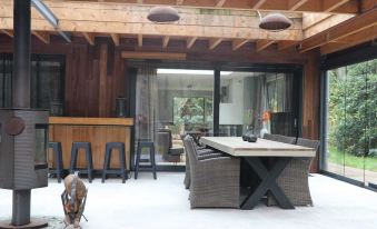 The bungalow has 2 bathrooms, both equipped with rain showers, and 2 toilets. Warm up in the spacious living room with underfloor heating and the large wood stove, protected by a large rack for child safety. Cook cozy meals on the large kitchen island with 4 seats and relax at the 8-person dining table, under the patio with a wood stove, or on the lovely outdoor terrace. Enjoy the heated outdoor shower and the convenience of the separate laundry room with a washing machine and dryer. Explore the forest plot of over 1000 m2 and play a game of table tennis. Easily park 2 cars on the property.