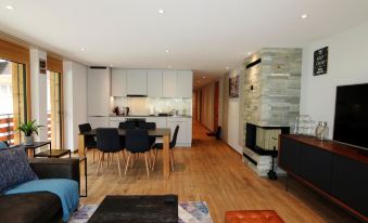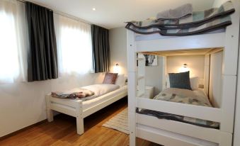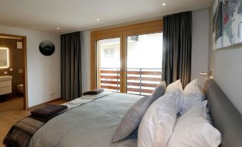 Located on the second floor (elevator available), the Derby apartment (*****) is a sleek and modern apartment for up to 5 people. It features a master bedroom with en-suite bathrooms (rainfall shower, WC, sink, hairdryer) and a tipple room with bunk beds. An additional bath room with WC and Shower is available. The apartment has an open kitchen with dining area, living room with fire place and flatscreen-TV. The kitchen is fully equipped with dishwasher, oven, stove, coffee machine, toaster, kettle, cheese fondue set and raclette oven. Panoramic mountain views from the private south facing balcony and wireless internet available. Private and heated ski storage facility is available in the building. Laundry room with washer and dryer is available in the building. The apartment is non-smoking. No pets are permitted. No ski teams permitted.
