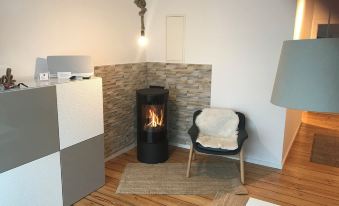 In the living room, opposite the comfortable corner sofa, a gas-heated fireplace is integrated, which prepares additional cozy warmth on request.