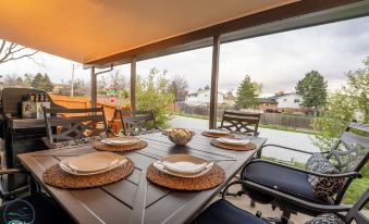 The backyard is designed for comfort and connection. Enjoy evening conversations around the fire pit, dine under the at the outdoor dining area with a BBQ grill, or unwind in the hot tub after a day of adventures. It’s a true extension of the home’s welcoming vibe.