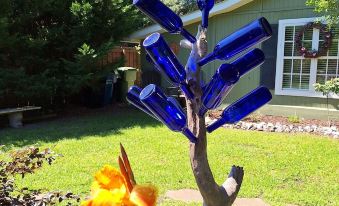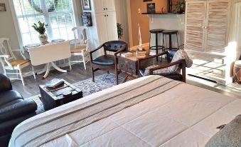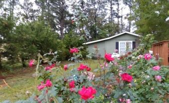 This 465sf Cozy Cottage comes with all the necessary amenities for a comfortable stay. Amenities also include washer and dryer, the full kitchen minus a dishwasher, Keurig for coffee, tea, pots, pans, dishes, utensils, etc... A small brick private patio off the back of the cottage has a table and two chairs, a lion fountain, and roses and flowers seasonally. Other outdoor spaces include the fire pit and the patio room. The fire pit and patio room are shared spaces but your back patio is all for you. Please note that there is no smoking or vaping of anything inside the patio room. All vaping and smoking must be done outside. The cottage has an open floor plan design with a queen size bed. There is also a small drop leaf table (that gets much larger), and two chairs that can be used for eating, a work space, or for playing board games on a rainy day. The large flat screen tv is a roku smart tv with streaming capability. Use the Spectrum App provided to access basic channels or use your own apps like Netflix, Prime, Hulu, HBO, etc... There is also a dvd player and a library of fun dvds. For a full list of amenities, click to see amenities.About pets:No pets allowed.Including service animals. Sorry..About checkOut:Check out before 11:00 AM.About children:Adults only.About customRules:First and foremost, absolutely NO GUNS OR WEAPONS allowed on property!!! If you feel you must have a gun, you will need to stay somewhere else..The second most important rule, is the use of illegal drugs are not permitted anywhere on property.,No hair dies may be used in cottage as it may cause staining of towels, shower curtain, floor mat, etc... Also, bath towels may not leave cottage..About checkIn:Check in after 3:00 PM.About smoking:Smoking is not permitted.No vaping..About minBookingAge:Minimum age to rent: 21.About events:No events allowed.