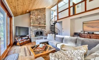 House sits high on top of a hill in the Maplecrest Hollow, a quiet valley with little traffic and abundant wildlife. Main level offers professional quality kitchen with bar stool seating around the large granite island. Dining area has view out to the South on the mountains across the valley. In the living room, conversation pit is anchored by a ceiling-height (non-working) stone fireplace. A primary bedroom with ensuite and a second bedroom a full bath are on the main level. Upstairs features a four-bed bunk room, full bathroom and movie loft (also with gorgeous mountain views).