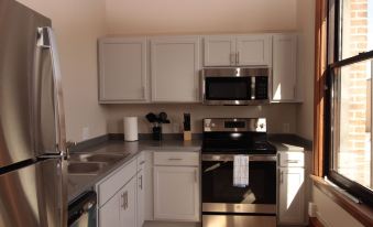This studio bedroom comfortably sleeps 2 people on a king size bed. Spacious open area offers original flooring, high ceilings, large windows with lots of natural light, and tons of character. Our modern kitchen boasts granite countertops and stainless-steel appliances. Convenient in unit washer and dryer are provided. Bring your pet along for your adventures in Winona. Wifi included. In walking distance to local attractions, coffee shops, restaurants, brewery, bars, movie theater, parks and walking/biking trails, Mississippi River, Winona State University and more!
