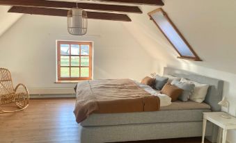The attached to the Verwalterhaus apartment with separate entrance, a kitchen, a living / dining room, two bedrooms (in the DG and EC) and shower room can accommodate 2-5 people. The apartment includes a parking space and a spacious garden with swimming area. Boating, swimming, barbecues, table tennis, as well as a swing for the younger guests, invite you to linger.