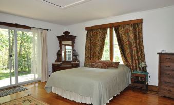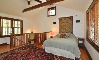 There are three bedrooms and two bathrooms. Two of the bedrooms have queen-sized beds, and the third has an antique brass double bed. The third bedroom/study, upstairs, has a cathedral ceiling as well as a spectacular view. The house sleeps 6 adults comfortably. (If there are children, it may be possible to accommodate them on the pull-out futon couch—please discuss this with the property manager.)